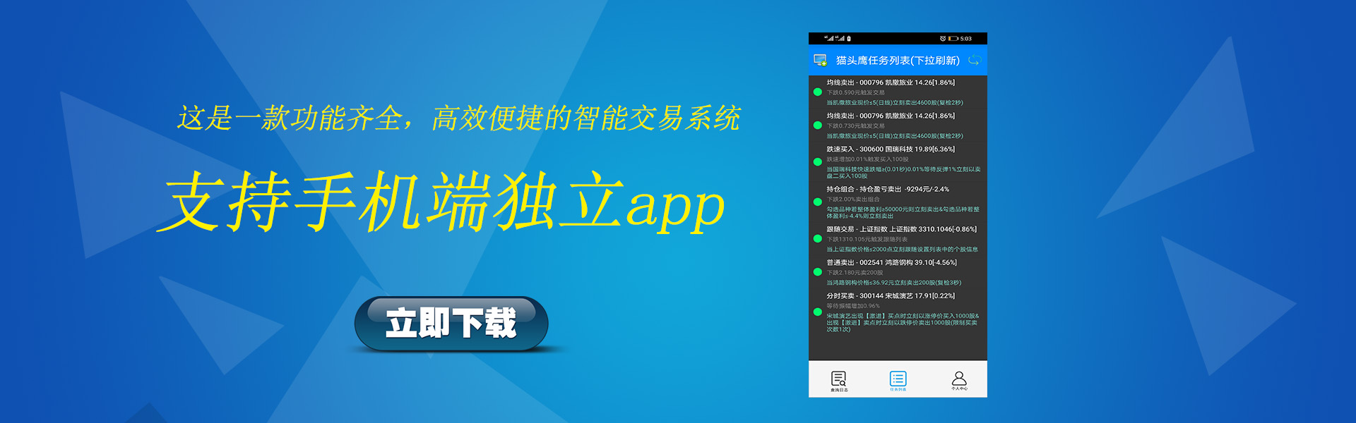 猫头鹰智能交易系统是一款演示的自动交易系统,它主要为用户演示及展示功能,方便用户自定义自己的策略,模型,指标等以达到自定交易个性化定制需求。 该系统可实现指标公式预警交易、光速自动打板、闪电交易、语音下单、移动止盈、自动止损、双向卖出、拐点交易、阶梯交易、定时交易、跟随交易、一键清仓、上证清仓、均线交易、高级均线、组合均线,区间网格交易、开板卖出,涨速买入,组合持仓盈亏,智能AI决策,分钟循环,分时均价,一键批量导入等近30种自动交易功能,欢迎新老用户联系我们个性化定制模型,策略,功能插件,联系我们发送您的定制需求,我们将为您在线评估功能定制相关事宜。